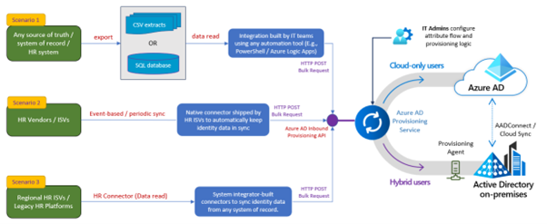 - Building direct integration with HR apps or student information systems that can send data to Microsoft Entra ID as soon as a transaction is complete or as end-of-day bulk update.